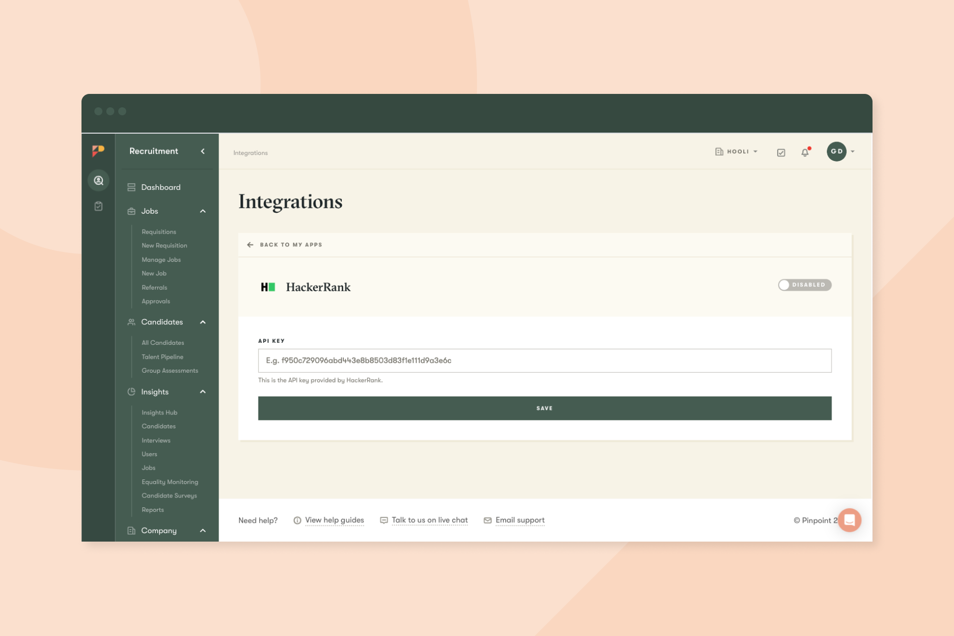 - Once the API key is saved, enable the integration and you’re all set! You can now start inviting candidates to take HackerRank assessments.