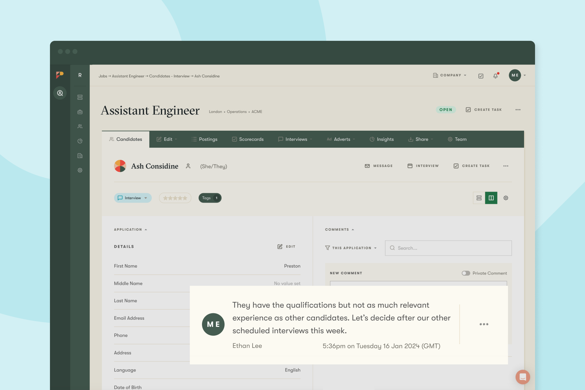 So everyone in the Talent team can see what’s going on with each vacancy in real time. This helps ensure every candidate is getting consistent communication, and helps the Talent team with holiday cover.