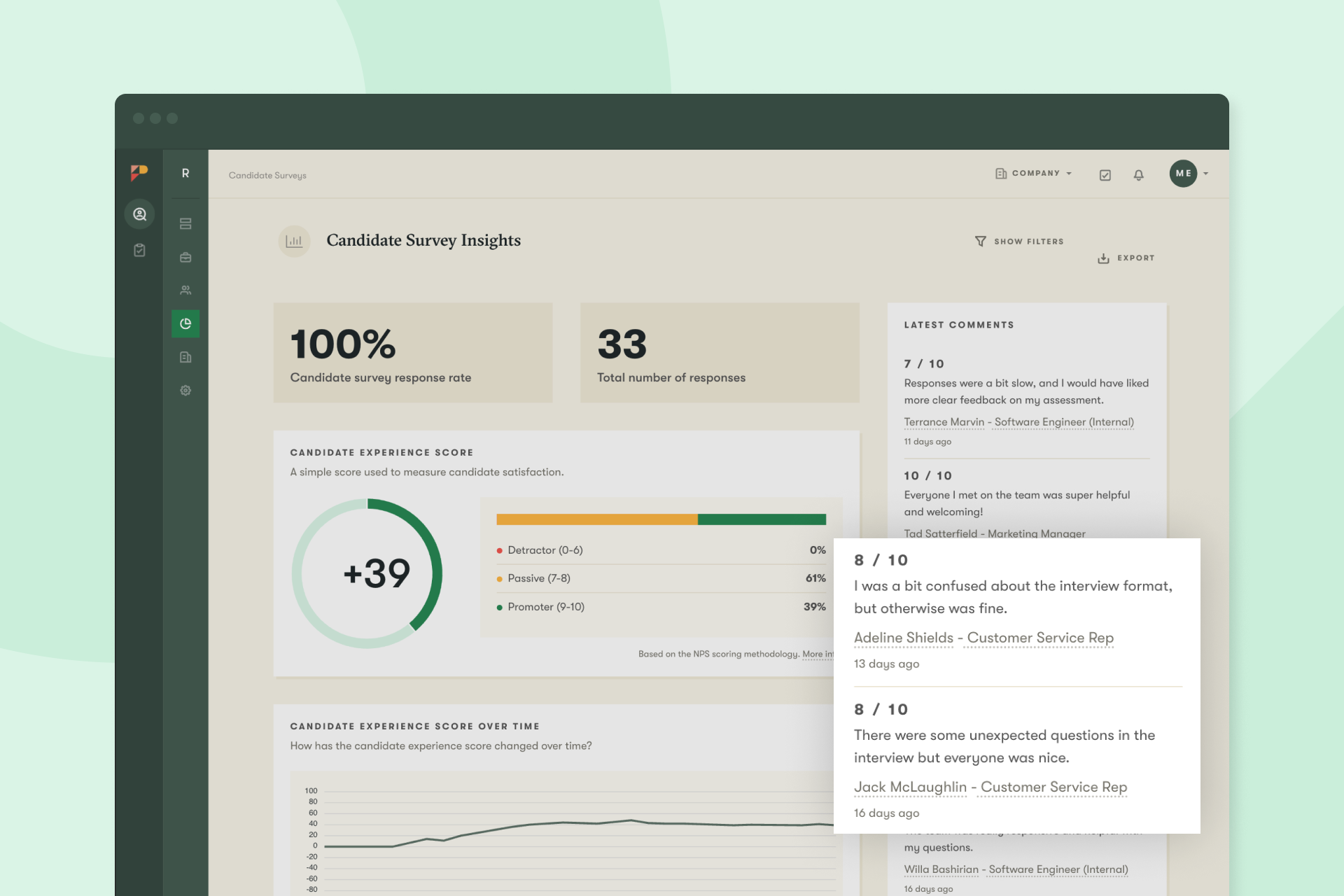 - Candidate NPS: Automated candidate feedback surveys will give you candidate Net Promoter Scores that you can track over time and compare across recruiters or hiring managers.