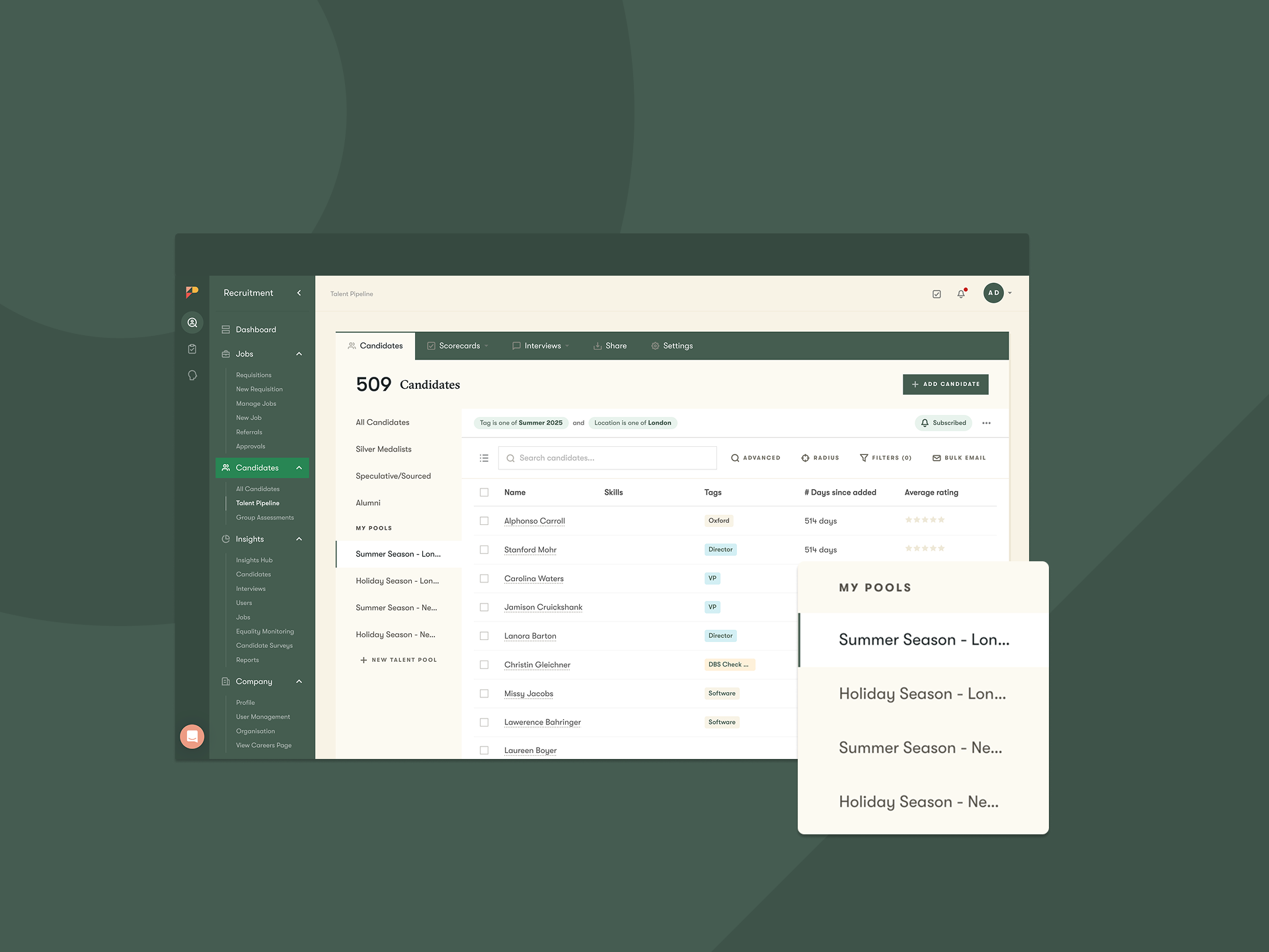 Talent Pools make the whole process seamless. Instead of juggling spreadsheets and manual lists, you can keep last year’s best hires together in one place.