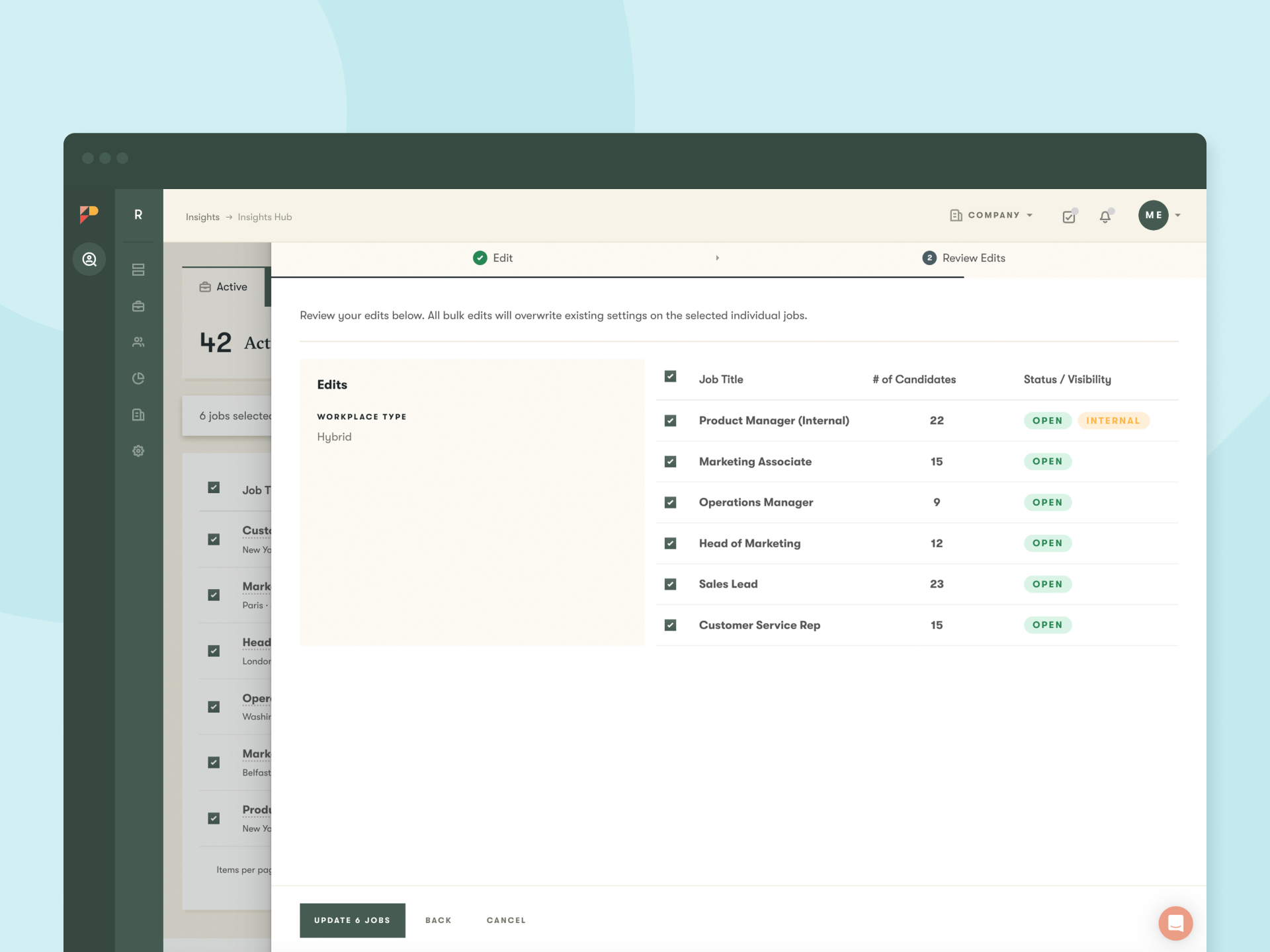 Easily update jobs—at scale. With bulk job editing, you can change the status or edit the details of multiple jobs at the same time.